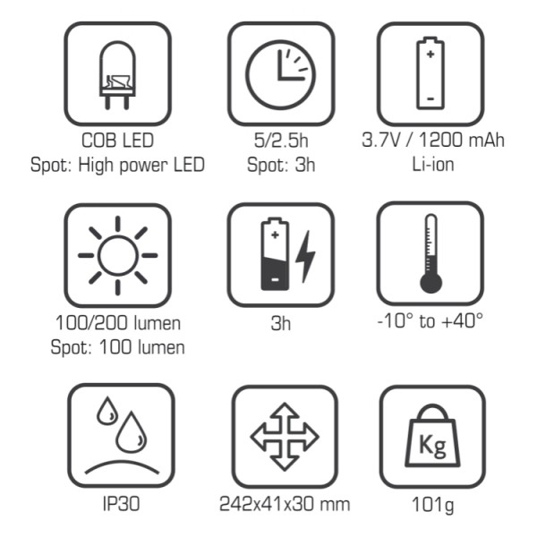 - Autonomía de 5 / 2,5 h (dependiendo del nivel de luz seleccionado).