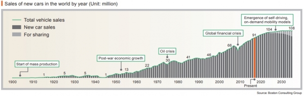 La historia de los automóviles comenzó con un coche a vapor nacido en Francia en 1769. El tipo de automóviles desarrollados después de los coches a vapor fueron en realidad vehículos eléctricos (EV). Los vehículos eléctricos comenzaron a desarrollarse a principios de 1800 y tienen una historia más larga que los vehículos con motor de combustión interna (ICEV) propulsados por gasolina, que nacieron a finales del siglo XIX. Los tres tipos de automóviles - vehículos a vapor, eléctricos y de gasolina- se extendieron alrededor de 1900. En EEUU, la proporción de vehículos eléctricos era grande en ese momento y se dice que la mayoría de los taxis que operaban en la ciudad de Nueva York eran EV. Aunque se preveía que los vehículos eléctricos estuviesen más implantados, los ICEV se convirtieron en la tendencia en el siglo XX debido al establecimiento de su superioridad en rendimiento y precio tras el comienzo de la fabricación en serie del Ford Modelo T, lanzado en EEUU en 1908.