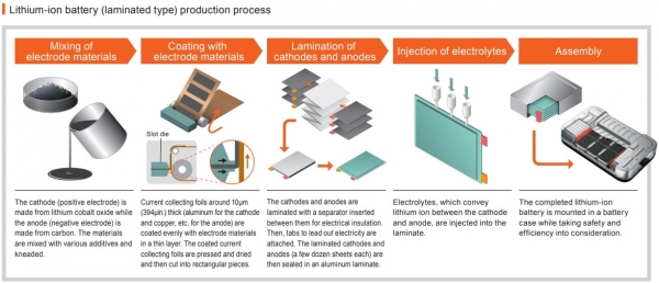 Mientras que las baterías de almacenamiento de plomo, las baterías de níquel-hidrógeno, etc. se usan en automóviles convencionales, las baterías de iones de litio (LiB) han sido utilizadas en los últimos años por los vehículos eléctricos. La difusión de las LiB viene impulsada un aumento en la capacidad y una reducción en el precio, y se estima que la demanda de LiB en la industria de automoción casi se duplique en los próximos cinco años. El refuerzo de la línea de producción está en progreso en todo el mundo.