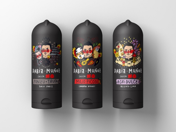 - El packaging de “Dabiz Muñoz Salsas XO” refleja el universo creativo e inspirador del chef: viajes, culturas y sabores que giran alrededor de su cabeza. La forma del envase hace que el producto sea muy fácil de utilizar, pero lo que hace que sea tan especial es su parte superior. El remate recuerda al característico corte de pelo de Dabiz Muñoz (“estilo mohicano”). La colección completa son once salsas.