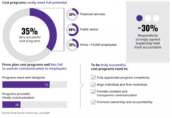 Oliver Wyman realizó una encuesta para destacar la gestión de costes que se diferencian del resto. Para ello, seleccionaron participantes de todos los sectores con experiencia en acciones de reducción de costes, analizando así qué funciona mejor. Más del 81% de los encuestados estuvieron de acuerdo en que su empresa tenía un enfoque claro y bien planificado de su programa de costes, pero sólo el 35% de los participantes considera que su programa fue exitoso.