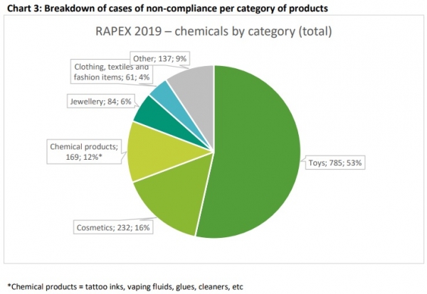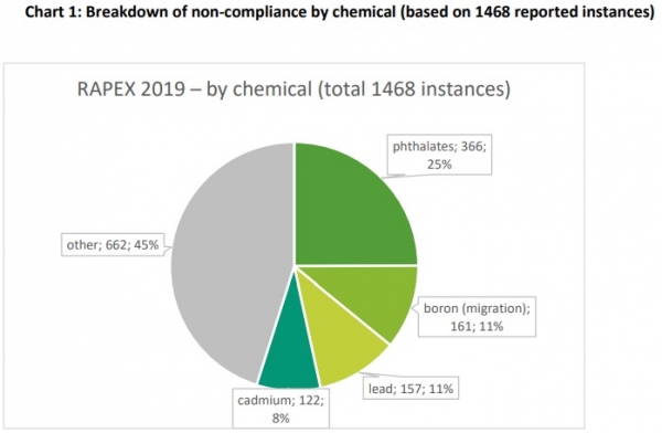 Los ftalatos restringidos, que se encuentran principalmente en los juguetes de los niños, son el caso más frecuente de incumplimiento de REACH, con un 25%. El número total de los incumplimientos químicos recogidos por Rapex ha aumentado en 2019 en un 24% en comparación con 2018.