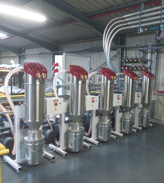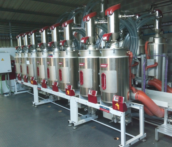Unos meses más tarde, ahora en Galicia, la misma firma Wittmann realizó una instalación de alimentación centralizada para todas las nuevas máquinas en la ampliación de su planta de Orense: un sistema diseñado con la última tecnología Wittmann Feedmax, cumpliendo así otra vez los objetivos de eficiencia y calidad exigidos por el grupo. Este sistema para la manipulación de materiales está especialmente proyectado y configurado por los ingenieros de Wittmann para obtener los requisitos y necesidades más rigurosas de Megatech Industries en cuanto a capacidad de transporte y deshumidificado de los materiales más técnicos, logrando un correcto suministro de la materia prima en perfectas condiciones para unos repetitivos ciclos de producción. Para ello, se utilizaron 2 deshumidificadores centralizados Wittmann Drymax Battery con 6 tolvas de secado Silmax, 3 bombas de vacío con filtros de limpieza automáticos, varios cargadores de material Feedmax para la correcta alimentación tanto a deshumidificadores como a máquinas y mesa de mezclas codificada, todo ello controlado por un equipo de mando central M7.3 de última generación, que permite una gestión idónea del secado y la carga, optimizando una producción más vigilada.