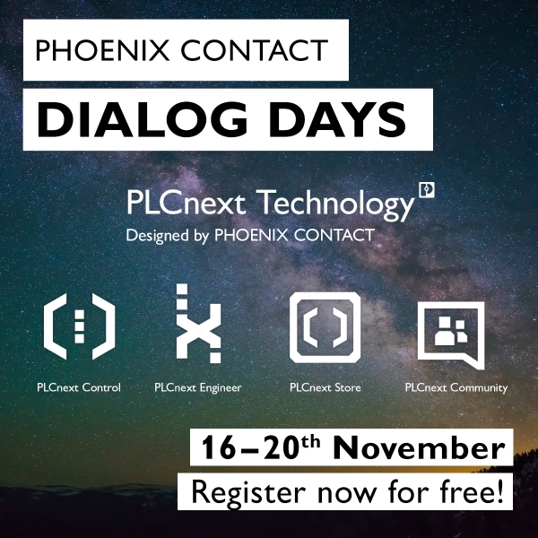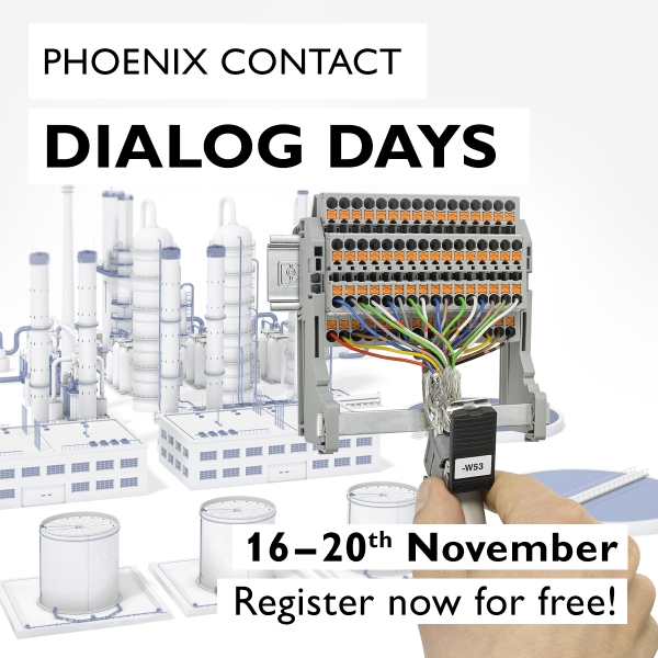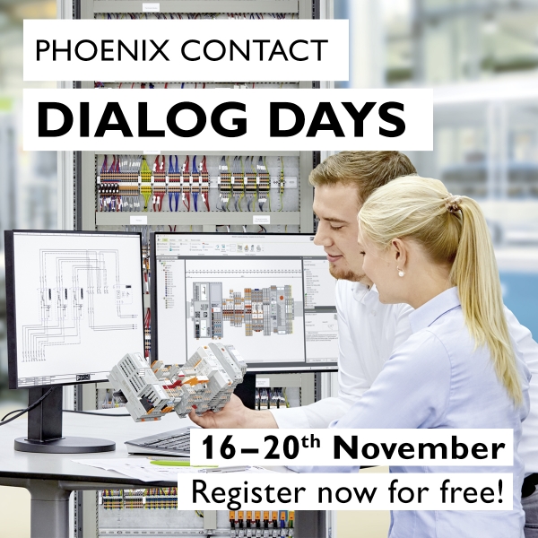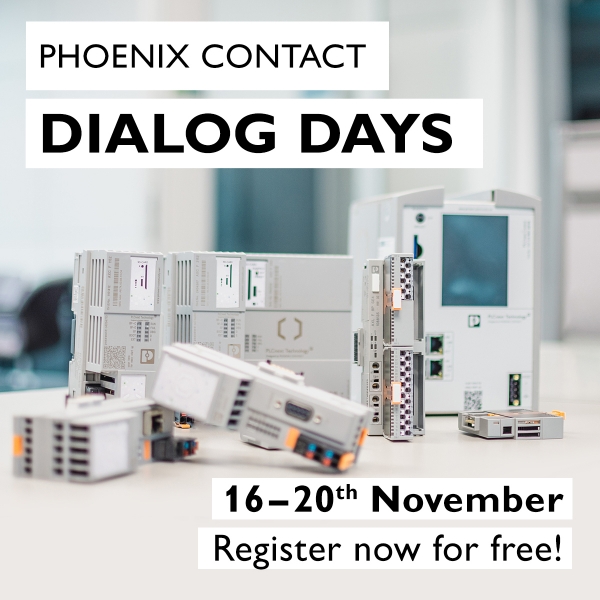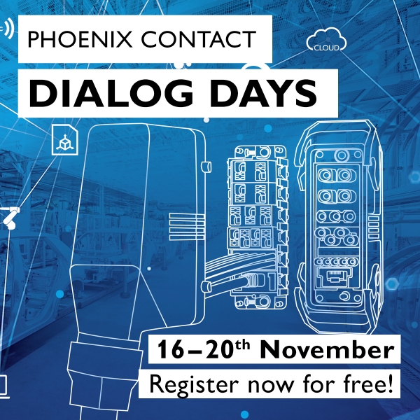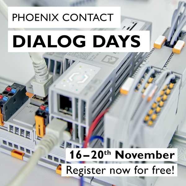 Del 16 al 20 de noviembre, la central de Phoenix Contact en Alemania celebrará unos nuevos “Dialog Days de Phoenix Contact”. La dinámica de estas jornadas será similar a la del evento realizado el pasado mes de abril, que dio conocer las novedades que inicialmente se iban a presentar en Hannover Messe. En esta ocasión, también contará con charlas, feria virtual y visitas guiadas. El evento será internacional y se realizará íntegramente en inglés, a excepción de las visitas virtuales, que en principio estarán disponibles en distintos idiomas, entre ellos el castellano.