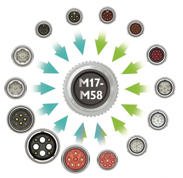 El programa de conectores circulares abarca desde conectores para señales, conectores híbridos y de potencia en los tamaños M17 a M58.