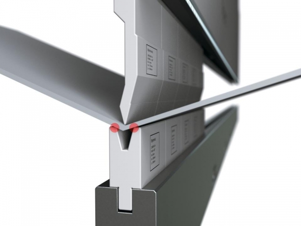 En el plegado al aire o plegado libre de las prensas plegadoras de Bystronic, el punzón presiona la pieza de trabajo hacia la apertura de la matriz, aunque sin alcanzar la base de la misma. De este modo, la pieza de trabajo permanece apoyada solo sobre los dos bordes de la matriz durante todo el proceso de plegado. El ángulo de plegado se determina según la profundidad a la que se introduce el punzón en la matriz.