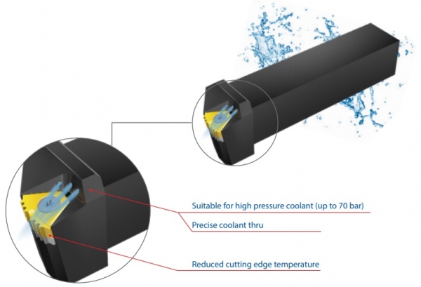 - Refrigerante preciso a través de la herramienta, diseñado para refrigerar eficientemente el filo de corte.