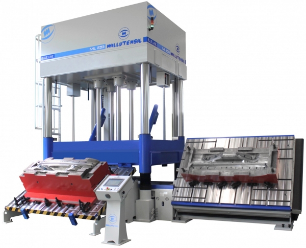 Las prensas de ajuste de moldes de la serie MIL CLASSIC presentan la salida del plato extraíble en el lateral, hacia el lado estrecho de paso de las columnas. Su campo de aplicación es el típico sector del plástico, la goma y la fusión a presión. Esta solución permite la basculación en el lado corto del plato extraíble hasta un 70º a ambos lados. En esta versión, también el plato superior es basculante en el lado corto desde 100° hasta 150°/180°.