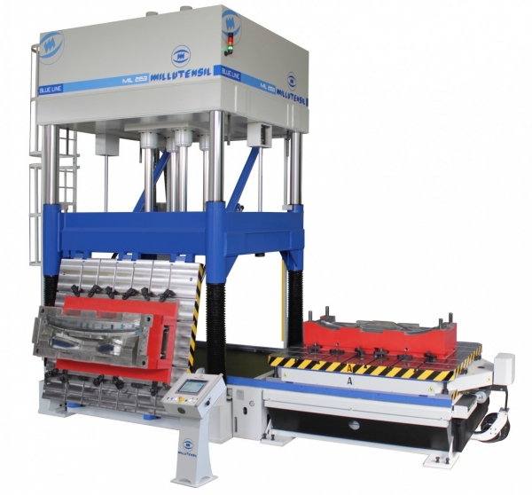 Las prensas de ajuste de moldes de la serie MIL CLASSIC presentan la salida del plato extraíble en el lateral, hacia el lado estrecho de paso de las columnas. Su campo de aplicación es el típico sector del plástico, la goma y la fusión a presión. Esta solución permite la basculación en el lado corto del plato extraíble hasta un 70º a ambos lados. En esta versión, también el plato superior es basculante en el lado corto desde 100° hasta 150°/180°.