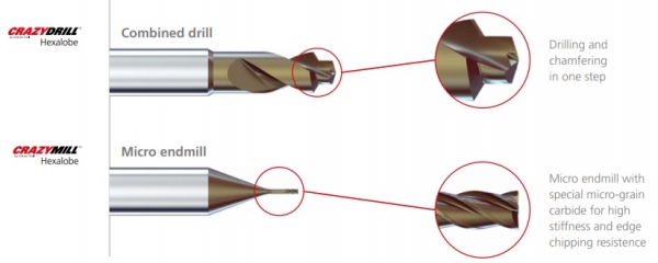 - CrazyMill Hexalobe – Microfresado: microfresa de metal duro de micrograno especial para una alta rigidez y resistencia al astillado de filos.