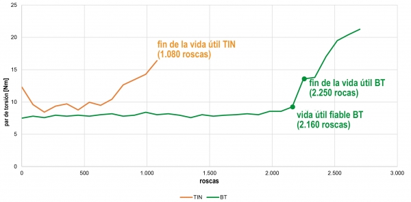 El recubrimiento BT fue diseñado específicamente para herramientas de roscado, que es por lo que convence de una manera innata gracias a una excelente resistencia térmica. Así, junto con la alta dureza del recubrimiento, el recubrimiento BT consigue una vida útil notablemente más larga y una velocidad de corte más alta en comparación con recubrimientos basados en titanio, tales como TIN y TICN, y en una amplia gama de materiales.