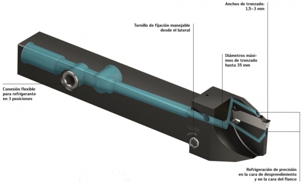- Herramienta de ranurado y tronzado patentada G4014-P / DX18 con refrigeración de precisión.