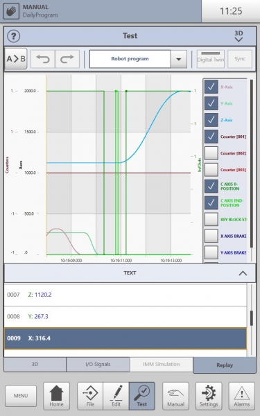 Tan pronto como el robot físico cambia al modo de funcionamiento automático, el gemelo registra todos los cambios en las posiciones de los ejes individuales, los puntos de entrada/salida, los contadores y el resto de valores relevantes para el funcionamiento del aparato. Todos los datos se registran con una precisión de 4 ms y se pueden rastrear hasta el pasado hasta 100 segundos. De esta manera, es posible acceder al registro en el momento deseado. Otro hecho vital es que los comandos de aprendizaje ejecutados también se guardan aquí.
