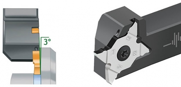 La disposición de la placa con una inclinación de 3º y las nuevas plaquitas de ranurado y tronzado con diseño plano en el lado de la pieza (en versión izquierda y derecha) permiten un ranurado profundo a lo largo de un escuadrado, sin contacto axial entre la superficie refrentada plana y la plaquita de ranurado y tronzado. El soporte para ranurado y tronzado en los nuevos tamaños de mango de 12 a 25 mm incluye refrigeración de precisión Walter. Las plaquitas de corte de 4 filos con rectificado de precisión están disponibles con la nueva geometría GD8 o VG8. La geometría VG8 se ha desarrollado especialmente para operaciones de acabado detrás de un collar.