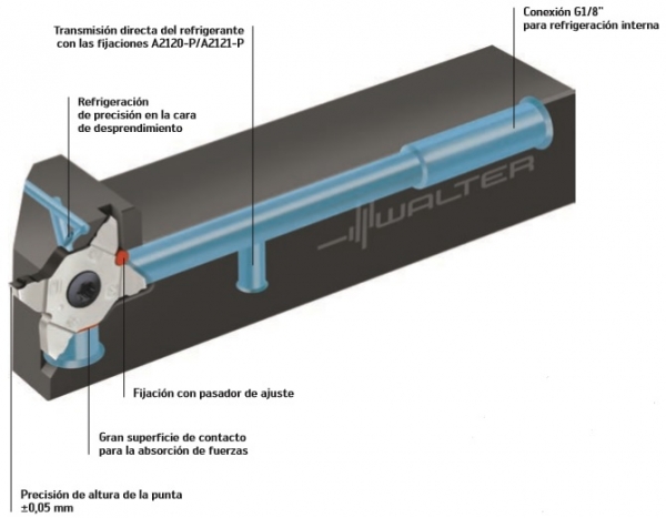 - Herramienta de ranurado y tronzado con refrigeración de precisión.