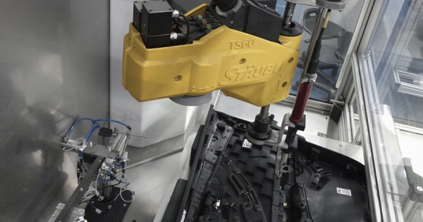 Los paneles de las puertas del Audi Q2 están disponibles en muchas versiones diferentes. Con el fin de mantener la flexibilidad en el ensamblaje de alrededor de 1.800 paneles por día, se implementó un concepto de ensamblaje híbrido en el que los Scara de alta velocidad de Stäubli y los trabajadores manuales colaboran en la inserción y el accionamiento de los husillos.