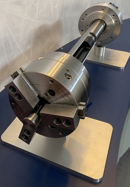 El sistema de sujeción completo de Kitagawa Europe Ltd. muestra en la imagen un QJR07 (chuck de cambio rápido de mordaza) con el más reciente cilindro hidráulico SR1453 de Kitagawa Japan. Está montado con un tubo de tracción equilibrado de 53 mm de diámetro interno que apoya a un sistema de expulsión de piezas de trabajo con resorte de gas y adaptadores de mandril y cilindro para montar en la máquina, todos originarios y fabricados por Kitagawa Europe en el Reino Unido.