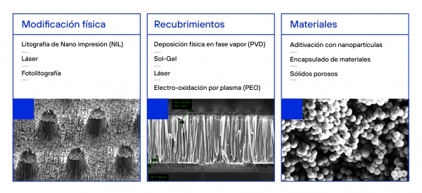 El centro tecnológico cuenta, además, con experiencia sobre polímeros. En este sentido, el centro desarrolla piezas de inyección con propiedades hidrofóbicas a través de la microestructuración del molde. Por otra parte, es capaz de fabricar nano- micro- y estructuras jerárquicas (nano+micro) para conferir superhidrofobicidad a polímeros en film mediante tecnologías de nano impresión y de roll to roll.