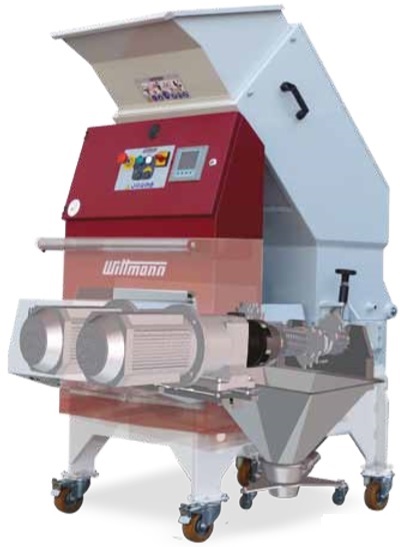 Equipado con dos rotores en la cámara de corte, para piezas y coladas de gran tamaño, el triturador sin rejilla Junior Double de Wittmann se coloca habitualmente fuera de la línea de procesamiento. El material se alimenta al molino mediante una cinta transportadora o vaciando el contenido de una caja directamente a la tolva de alimentación de la máquina. Dispone de una reductora resistente que se alinea automáticamente y es capaz de transmitir los fuertes choques de carga que aparecen al triturar los plásticos más duros.