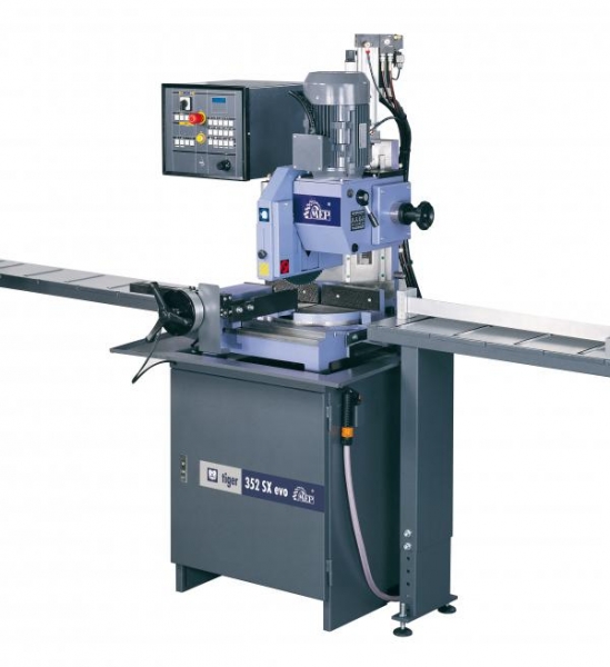 - COBRA 352 SX evo: sierra semiautomática, electroneumática, para el corte de aluminio y de aleaciones ligeras, con disco de dientes electrosoldados de metal duro. Máquina para el corte desde 45º a la derecha hasta 45º a la izquierda, orientable en sentido vertical para realizar cortes, con el cabezal inclinado de 0º a 45º a la izquierda.