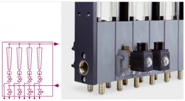 Los caudalímetros de las series 101 y 301 de Wittmann se pueden suministrar con válvulas solenoides de cierre y válvulas de secado. Uno de los ejemplos es la válvula E.
