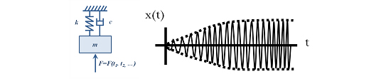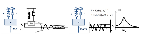 - Vibraciones forzadas: aparecen cuando se somete al sistema a una fuerza o excitación periódica F(t). Ejemplos de este tipo de vibraciones son ejes rotativos desequilibrados, componentes periódicas de fuerzas en fresado donde hay corte intermitente por el corte consecutivo de varios dientes o también vibraciones inducidas por maquinaria en las proximidades. El movimiento vibratorio resultante alcanza un estado estacionario donde la amplitud X0 es constante y la frecuencia de vibración es precisamente la de excitación. Si la frecuencia de excitación coincide con la natural del sistema, se habla entonces de resonancia. En ese caso, la amplitud de las vibraciones es máxima (Figura 1b).