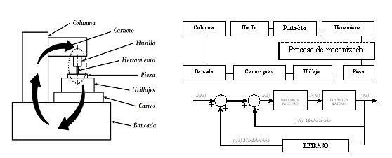 En la vibración auto-excitada, la modulación de la vibración inicial la realiza el propio sistema. La Figura 2 muestra el lazo físico de realimentación y el diagrama de bloques representativo del fenómeno. El origen de la vibración relativa pieza-herramienta puede ser un grano duro o discontinuidad en el material. El sistema devuelve una respuesta en función de sus características dinámicas cerrando y realimentando el defecto inicial que es un desplazamiento relativo entre pieza y herramienta. La vibración se mantiene y amplifica en los ciclos siguientes hasta que, llegado un punto, la herramienta se despega de la pieza. Por eso, llegado un punto, las vibraciones se mantienen y nunca crecen infinitamente, es decir, la vibración se autorregula.