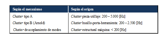 Existen distintas clasificaciones que atienden al mecanismo que lo genera al origen de la vibración, etc. (Tabla 1). El chatter tipo A es el más habitual y se refiere a condiciones donde la herramienta presenta una fuerte componente de vibración en la dirección de avance de la herramienta. Por el contrario, el chatter tipo B se produce en herramientas con una fuerte tendencia a vibrar en la dirección de la velocidad de corte. En cuanto a la columna derecha, aparecen los casos de: 1- chatter de pieza o de utillaje: habitual durante el acabado de las piezas, con un rango relativamente amplio de frecuencias dependiendo de si es un fenómeno más o menos local; 2- chatter de herramienta: para herramientas con alta relación de aspecto L/D; 3- chatter de máquina: con bajas frecuencias de vibración y asociado a procesos de desbaste.