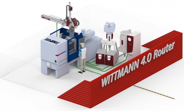 La opción Wittmann 4.0 amplía el control de la máquina Unilog B8 mediante un sistema de control separado de la célula de producción (el rúter Wittmann 4.0), el cual lleva a cabo varias tareas de comunicación, además de funciones de protección. Una de estas funciones es el cortafuegos externo, el cual ha sido optimizado para operar con máquinas de moldeo por inyección.