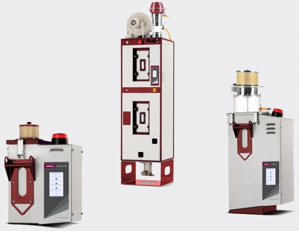 Secadores de hasta 70 l de volumen (correspondiente a un rendimiento sobre 20 kg/h de material) son perfectamente adecuados para utilizarse en máquinas de transformación y ofrecen una ventaja especial para tasas de rendimiento bajas: que no es necesario el transporte de material.